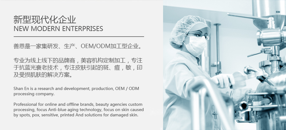 广州善恩化妆品有限公司(善恩集团),位于广州白云,是集研发、生产、OEM/ODM加工为一体的综合型化妆品生产企业。公司拥有超过10000多平方米GMPC标准的十万级消毒的现代化厂房,是欧盟认证的一流生产线,全国领先的护肤品、养生品贴标生产基地。