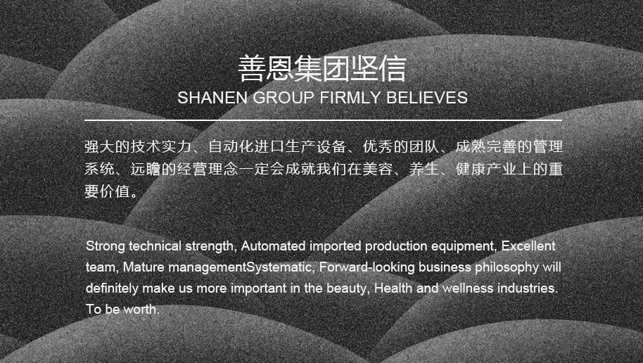 善恩专注于研发、生产健康天然的产品!尤为注重产品的研发与升级,汇聚全球顶尖专家与工程师,联合中大生化科技成立善恩科研中心,同时公司实行人才规划战略,确保不断引进并培养高学历、技术精湛的人才!善恩成立的愿景是:将爱与美的福音传递全球!我们将坚持以打造优质的产品为核心,为感恩更多的人;去帮助更多的人;去关心更多的人而努力,我们只想做一个感恩的企业。为客户提供省心省力的服务,做有良心的产品!